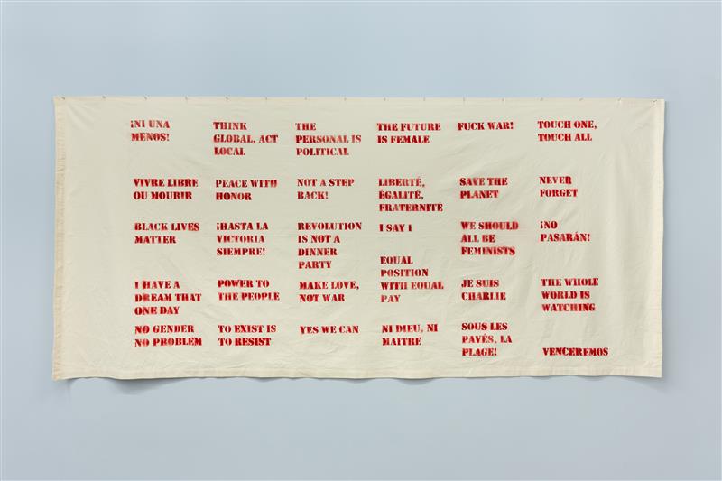I return to the weaving metaphor: what provides fabric density is the union between threads, just as what gives a larger dimension to the piece resides in the fact that 30 people (each with their bag and their slogan) become holders of a part that gives meaning to the whole. The political affirmations colludes the pieces with each other. By sharing these affirmations, the 30 pieces build a fabric that involves us all, together in a militant trench against totalitarianism, populism and oblivion.