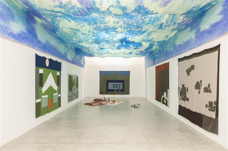 The gathering of these 5 idyllic gardens frames a picnic scene, where a series of copper-covered utilitarian objects are arranged on a classic checkered tablecloth. The blanket and two pillows evoke the meeting of two people. The suggested performative action is completed with fresh food, fruits, and bread. The environment is amplified by Natura #8, with the sound of running water and chirping birds. A group of five stones, three granite, and two white quartzes, marks a place of reverence. The blue neon phrase, “¡No te vayas!” flickers in the space. Hanging from the ceiling, the piece Move out, a large sky painted in shades of blue, protects and surrounds all the elements.
