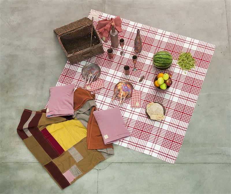16 copper-coated electroformed objects (wicker basket, 2 plates, 2 water glasses, 2 wine glasses, 2 knives, 2 forks, 2 spoons, penknife, 2 bottles. Towel and 2 napkins in red and white cotton. Samaras of sycamore.